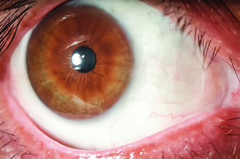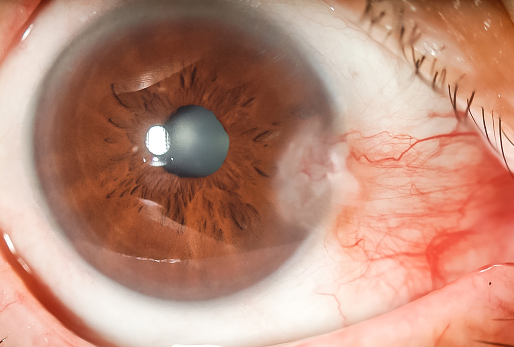 A pterygium is a wedge-shaped non-cancerous fibrovascular growth of the clear, thin tissue that lays over the white part of the eye (conjunctiva).